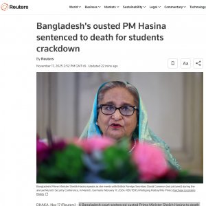 জুলাই গণ-অভ্যুত্থানের সময় সংঘটিত মানবতাবিরোধী অপরাধের দায়ে শেখ হাসিনাকে মৃত্যুদণ্ডের আদেশ দিয়েছেন আন্তর্জাতিক অপরাধ ট্রাইব্যুনাল-১। বিষয়টি গুরুত্ব সহকারে প্রকাশ করছে বিভিন্ন আন্তর্জাতিক সংবাদমাধ্যম।