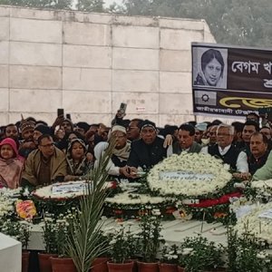 রাজধানীর শেরে বাংলা নগরে বিএনপির প্রয়াত চেয়ারপারসন বেগম খালেদা জিয়ার কবরে শ্রদ্ধা জানিয়েছেন ৯০ এর সর্বদলীয় ছাত্র ঐক্যের নেতারা। শুক্রবার (২ জানুয়ারি) বেলা সাড়ে ১১টায় শ্রদ্ধা নিবেদনের পর তারা কতক্ষণ নীরবে দাঁড়িয়ে থাকেন ও মোনাজাতে অংশ নেন। উপস্থিত ছিলেন ঢাকা